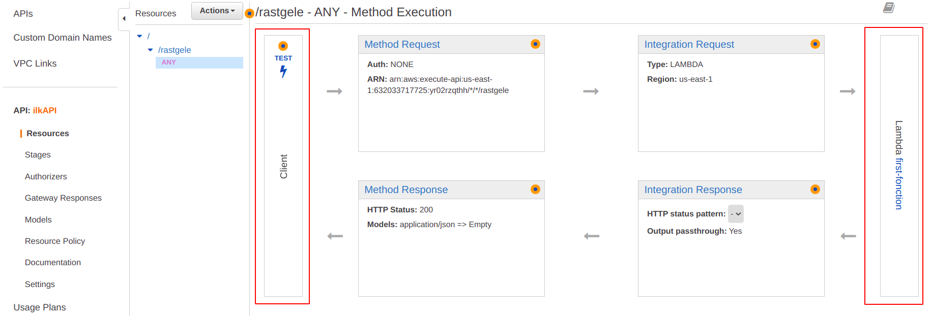 Yukarıdaki resimde ne yapacağını gösteriyor. İstek geldiğinde Lambda'ya iletecek Lambda çalışıp sonuç döndürecek. Test edelim. Çalıştığını gördükten sonra Action menüsünden deplay edelim.