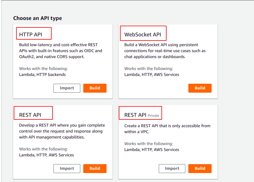 Rest API'yi kendi VPC içinde de kullanabiliriz bu durumda adı Private olmuş olacak. HTTP API hariç diğerleri Lambda, HTTP backend ve Diğer AWS servisleriyle entegreli çalışabilir.