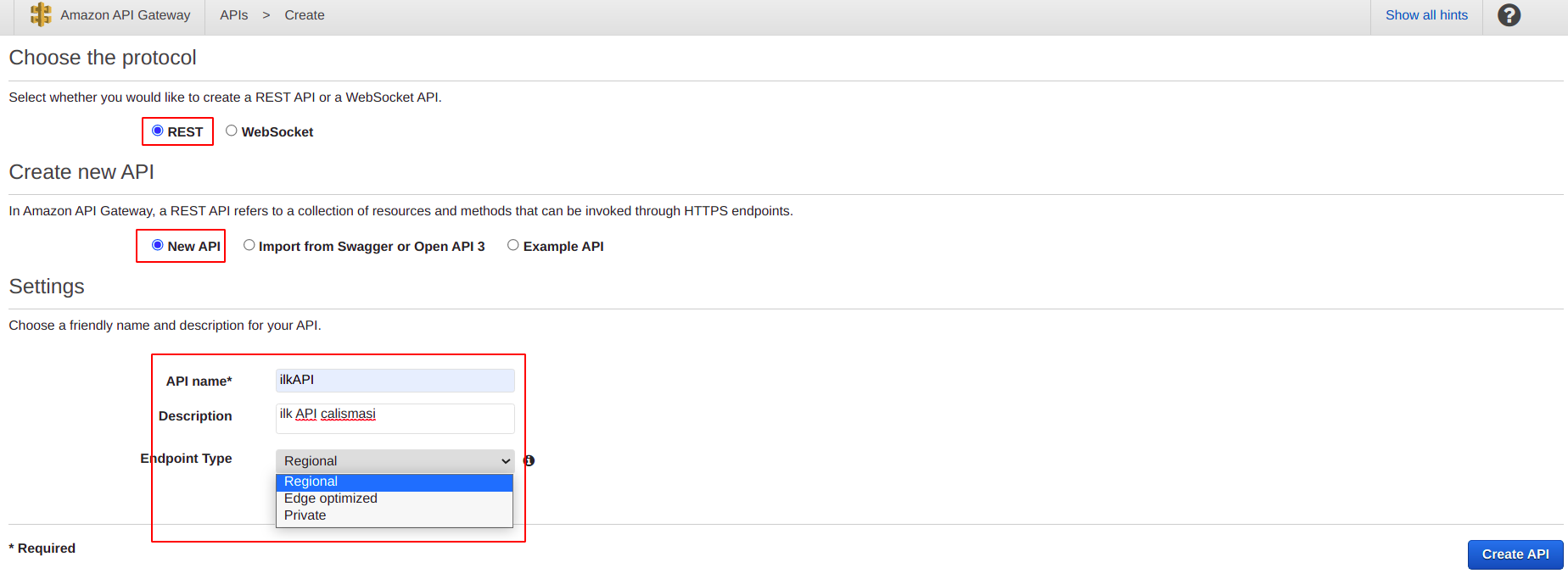 Protokol olarak REST seçtik. Hemen altında yeni API, örnek API veya daha önce hazırlanmış API'ı yükleme seçenekleri var. New API seçtik. Setting kısmında da regional seçerek oluşturduğumuz regionda çalışmasını isteyeceğiz. İstersek CloudFront ile Edge locationlardan kullanabilir veya VPC içi private bir API oluşturabilirdik. Create API'a tıklayalım.