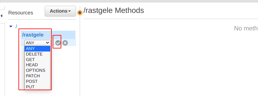 Şimdi aynı action menüsünden create method ile bir method oluşturalım, GET methodunu seçelim ve yanındaki tik işaretine tıklayalım.